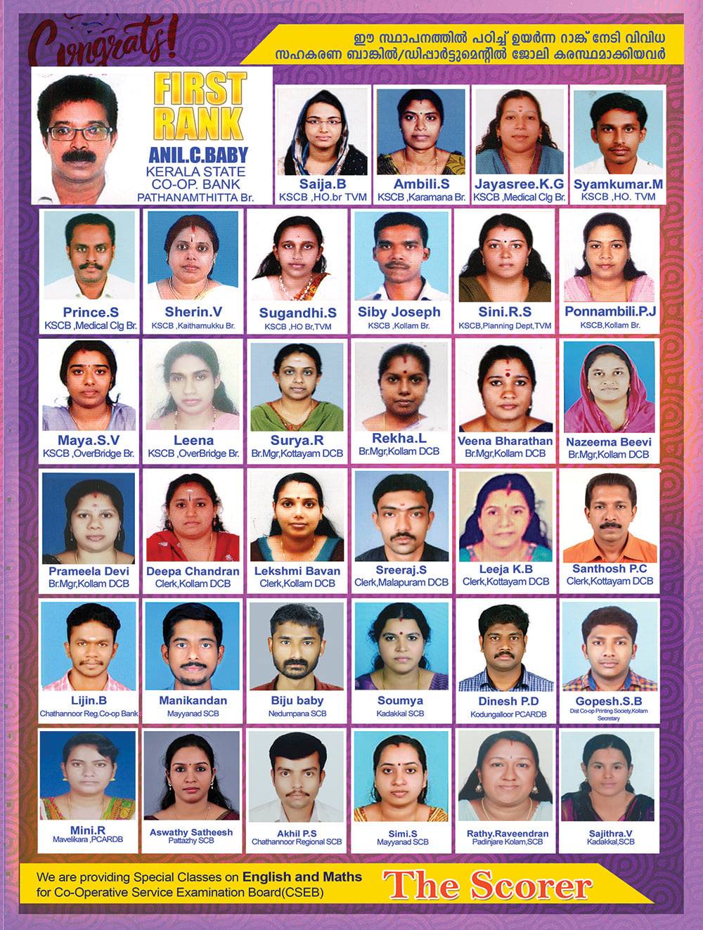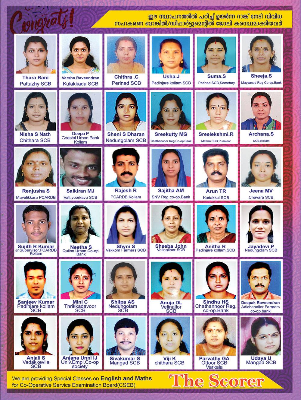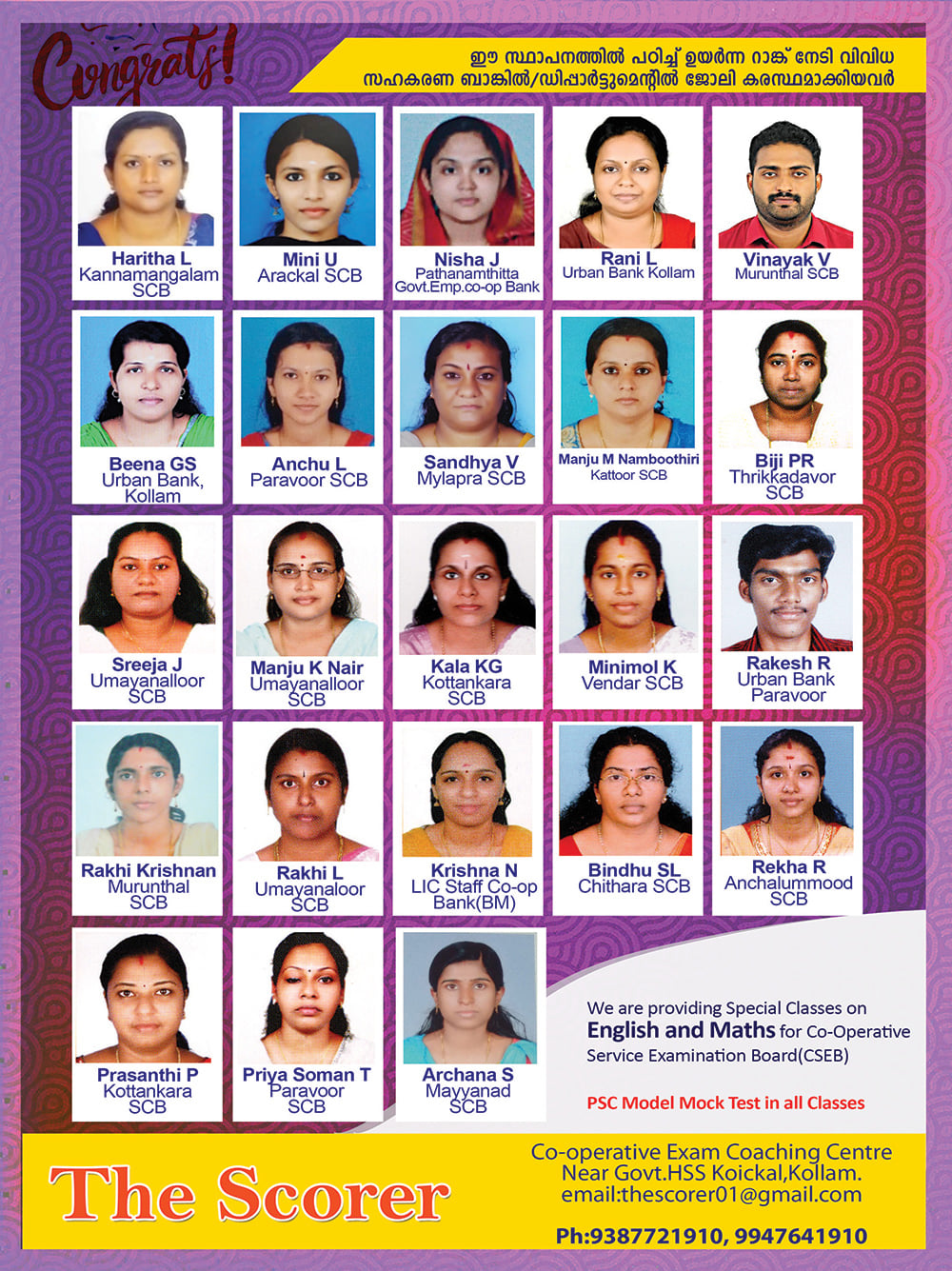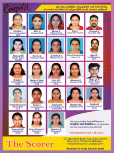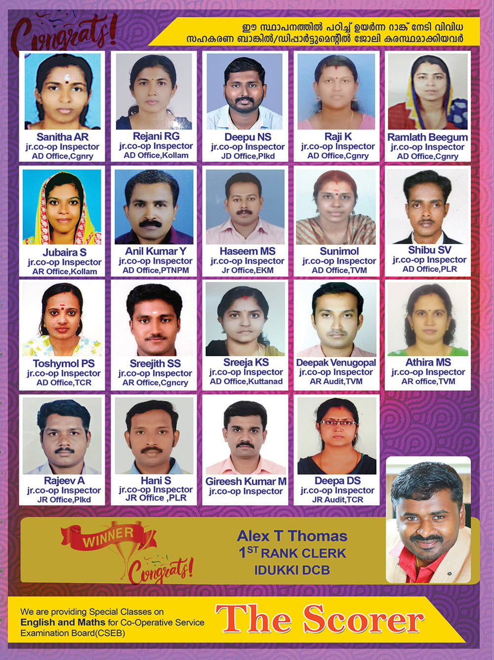 The one and only institution in Kollam district which provides coaching for candidates seeking jobs in co-operative sector alone. ‘The Scorer’ started in 2010 has helped about 2000 candidates to get appointed in co-operative sector so far. Coaching is given by an eminent crew in the supervision of veterans in Co-operative sector.